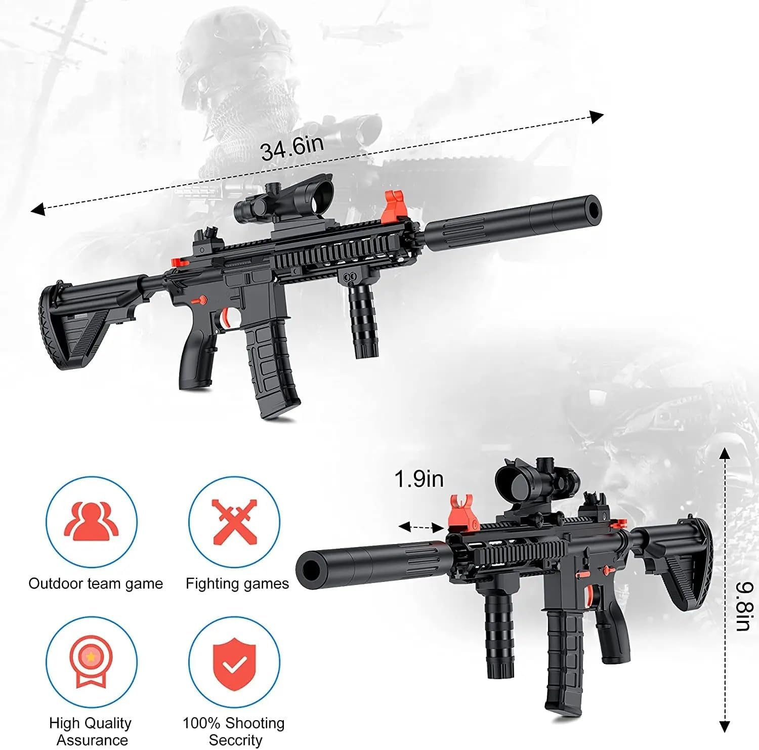 Con una longitud de 80 cm, este gel blaster puede adaptarse a diferentes situaciones y estilos de combate, desde combates a corta distancia hasta enfrentamientos a larga distancia.