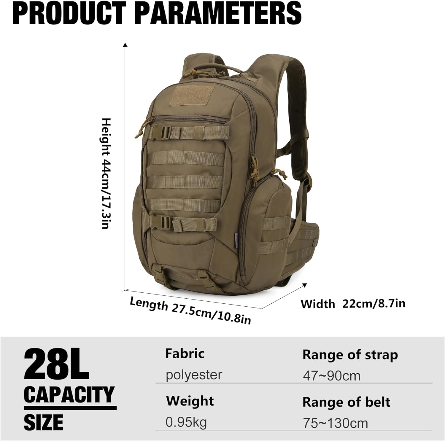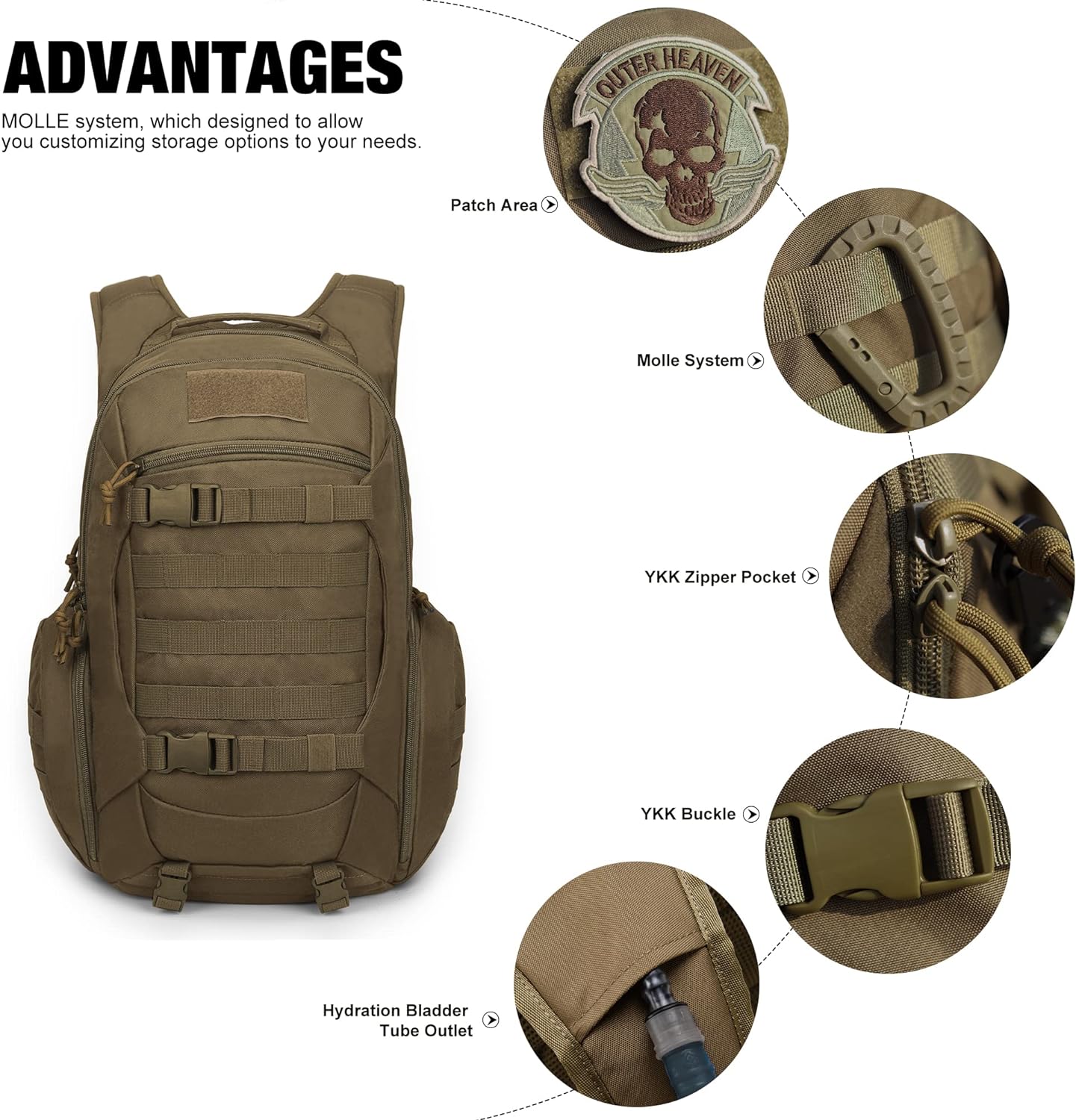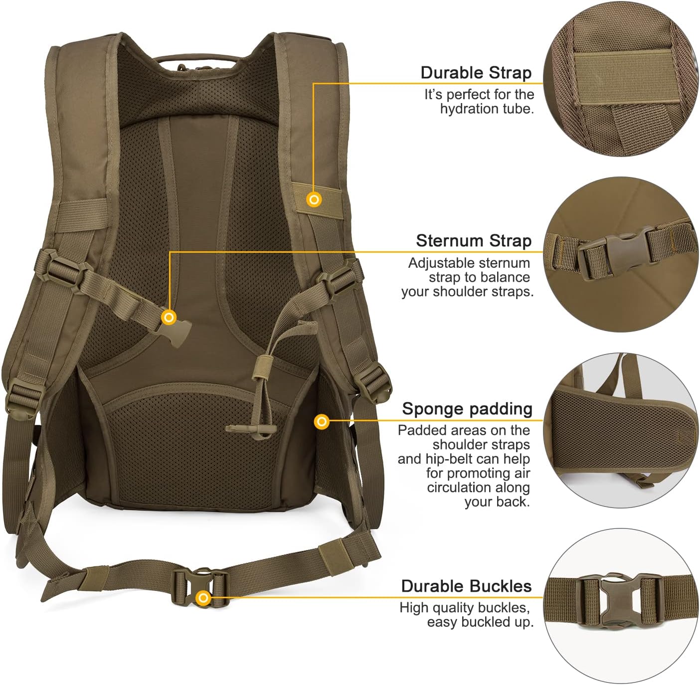 Opciones externas ampliables: La mochila táctica está equipada con el sistema MOLLE, que te permite ampliar la mochila según tus necesidades individuales. Coloca bolsas MOLLE o una bolsa para botellas de agua, por ejemplo.