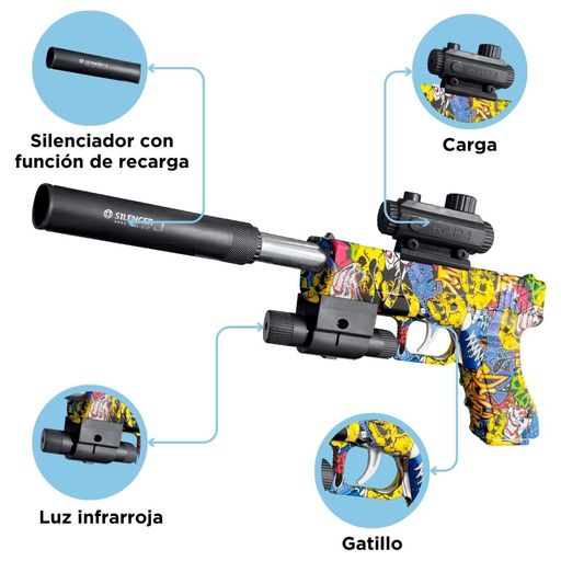 Increíble y divertida pistola de hidrogel para juegos de disparo al aire libre para grandes y chicos. La velocidad rápida y el largo alcance de disparo pueden darte una experiencia real y divertida. Ideal para todo tipo de ocasiones como fiestas, temporada de verano, piscina, playa, carnavales, aire libre, parques, etc. Fomenta el ejercicio físico, las habilidades en torno a un objetivo, la observación y la resistencia.